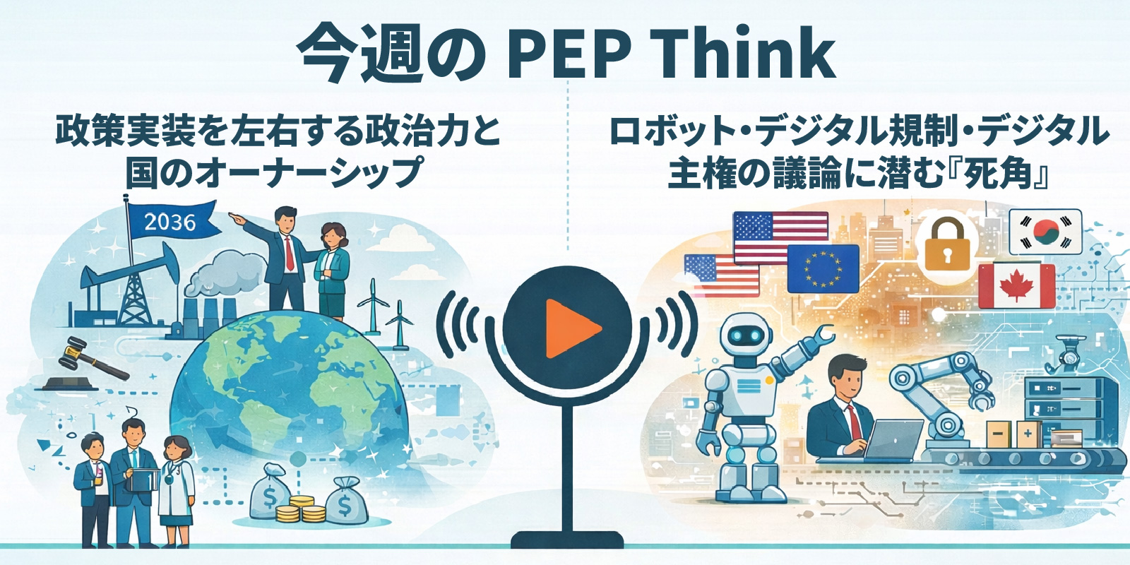 海外シンクタンクの議論を日本語で読み解き、日本のビジネスや政策への含意を考えるポッドキャストシリーズ 「PEP Think」。 今回は、「政策実装を左右する政治力と国のオーナーシップ」と「ロボット・デ...