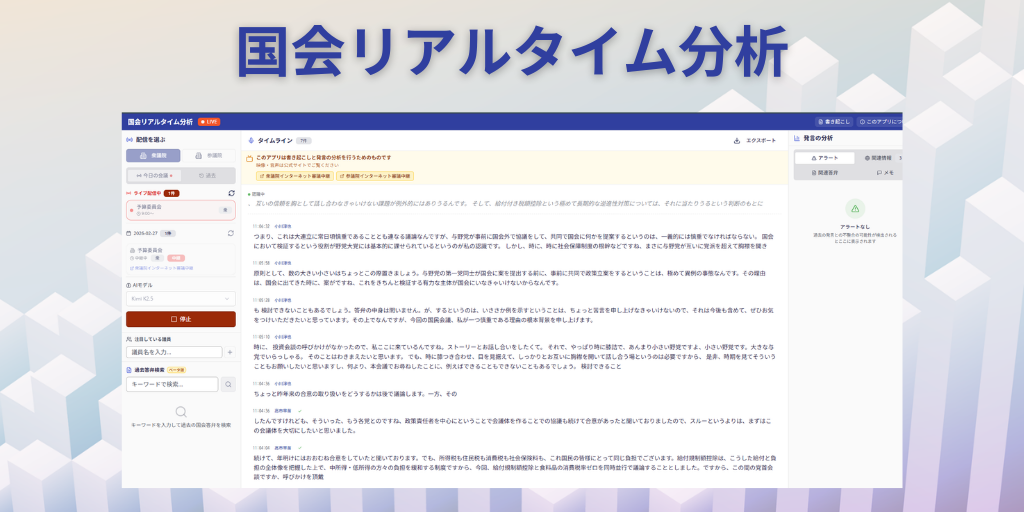 国会審議は、政策の論点や意思決定のための議論が最も行われる重要な場所です。一方で、会議は長く、論点は複数に分岐し、その論点の理解には様々な背景情報が必要なため、その論点をリアルタイムで整理するのは簡単...