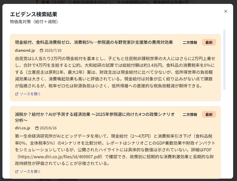 論点に関連したエビデンスをWeb 上で検索し、その結果を元に生成 AI が折衷案を再生成します。また、各党の主張や再生成時の注意点を編集・追記し、折衷案の再生成を行わせることも可能です。