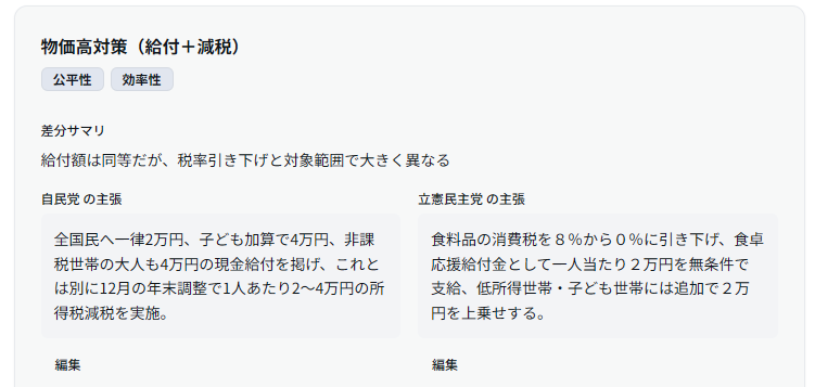 二つの政策群の論点を整理し、論点ごとに各政策の立場を整理