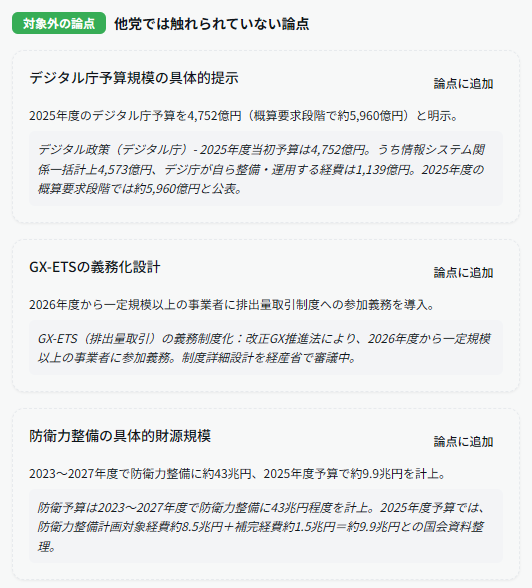 両党の政策を分析する際に、片方の政党による独自の論点の分析も行われます。その論点が検討に値すると思われる場合は、新たに論点に追加することで同様に折衷案の分析を行うことが可能です。