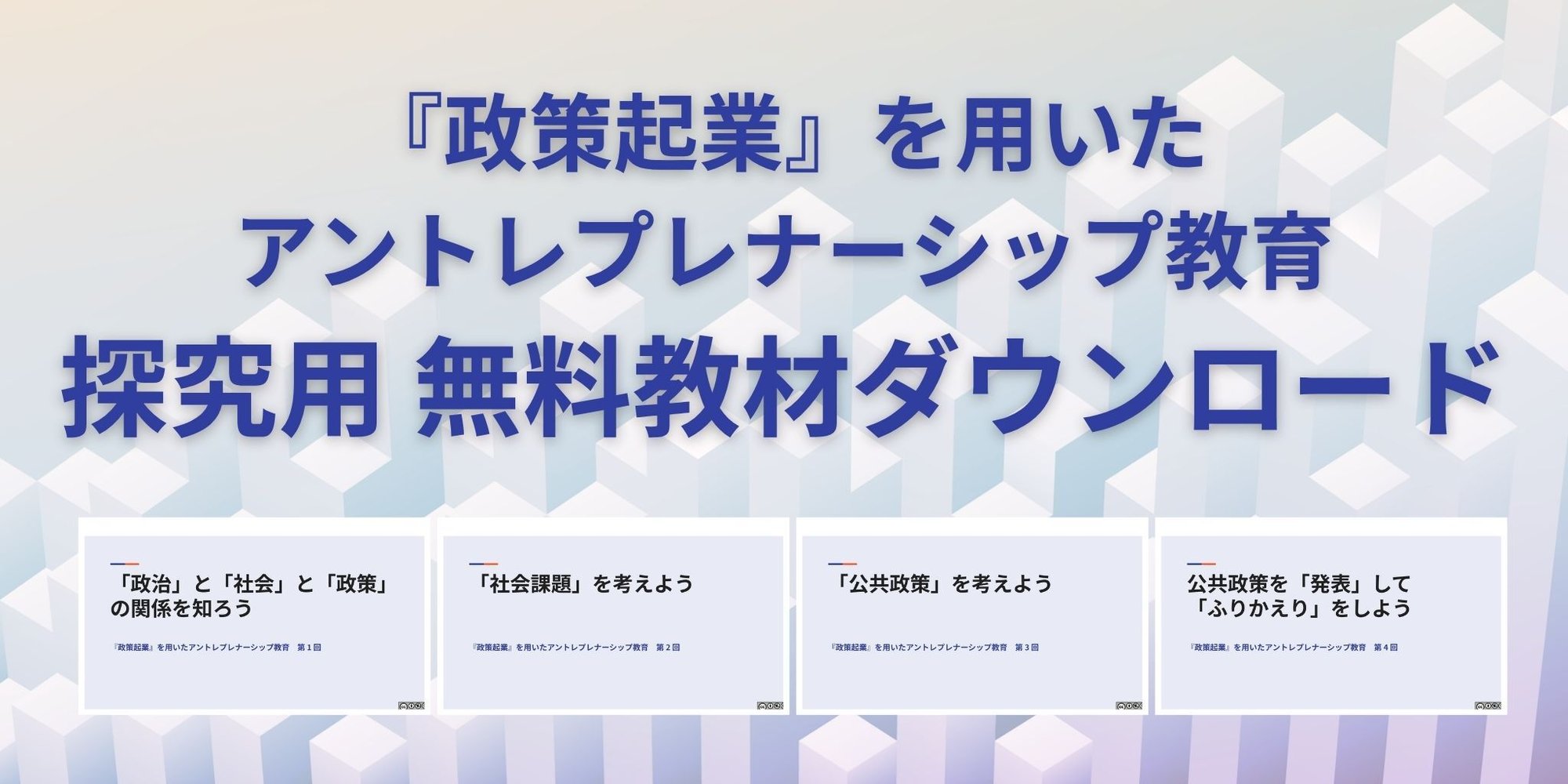 「社会課題を公共政策を通して解決する『政策起業』のプロセスを通して、アントレプレナーシップを涵養する」ことを目的とした、高校の『探究』などの授業で使っていただける無料の教材を配布しています。